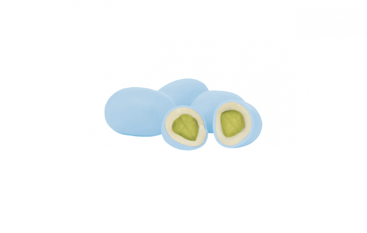 Pistacchio tostato ricoperto di cioccolato biancoe da un sottile strato di zucchero.