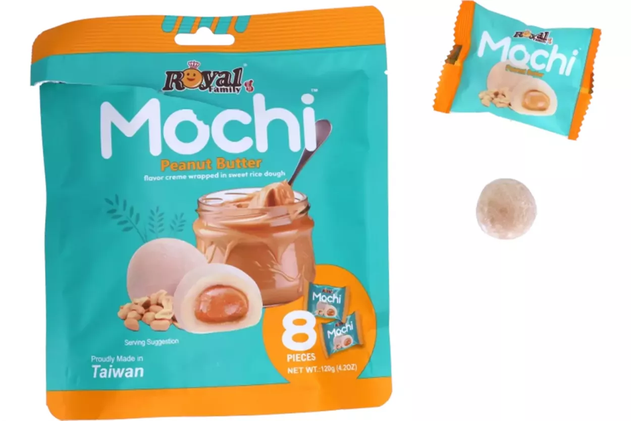 I Mochi Royal Family al Burro di Arachidi fondono l'originale dolcetto giapponese con un classico sapore amato a livello globale. La tradizionale pasta esterna di riso glutinoso (mochi) è morbida e gommosa, avvolgendo un ripieno denso e cremoso al sapore intenso di burro di arachidi. Questa combinazione offre una dolcezza equilibrata e una consistenza ricca e soddisfacente. Sono ideali per gli amanti degli snack esotici che cercano un gusto familiare con un tocco orientale. Ogni confezione contiene 8 pezzi (120g).